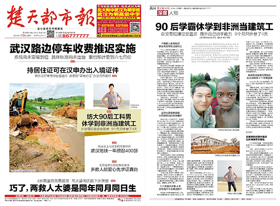 4月18日,《楚天都市报》以“90后学霸休学到非洲当建筑工”为题,头版深度报道了我院大三学生刘明休学一年到非洲参与水电站与安居房项目建设的新闻,引起了媒体的广泛关注和赞誉。