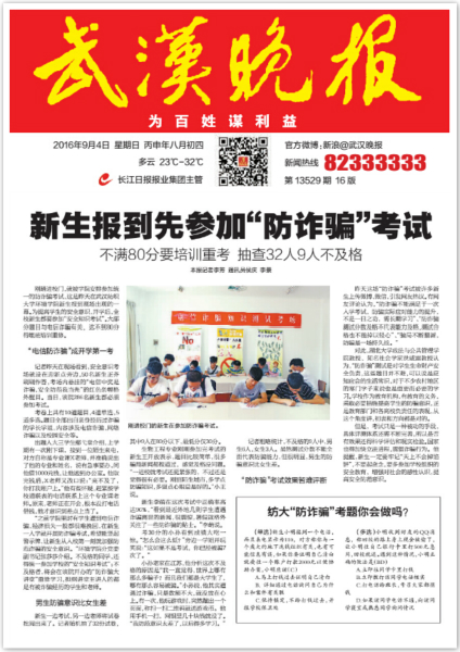 为了加强新生防范诈骗的安全意识,我院在新生一入学就开展防诈骗考试,大部分题目与电信诈骗有关,达不到80分得组班培训重修,《北京青年报》、《武汉晚报》等多家媒体重点报道,获评学校2016年十大外宣新闻。