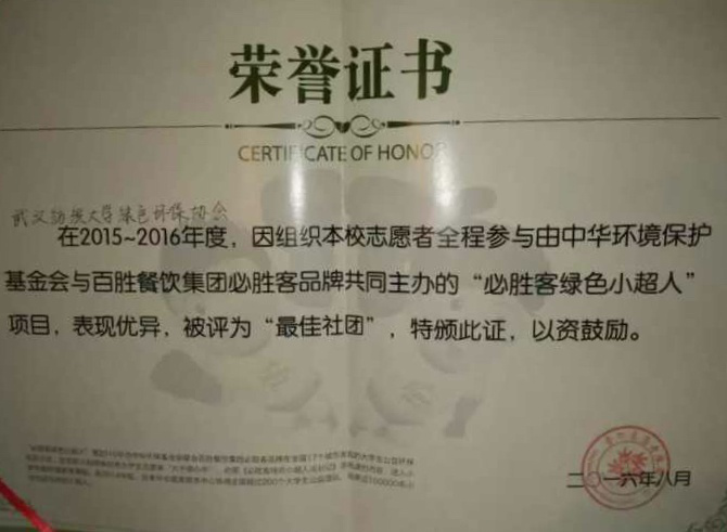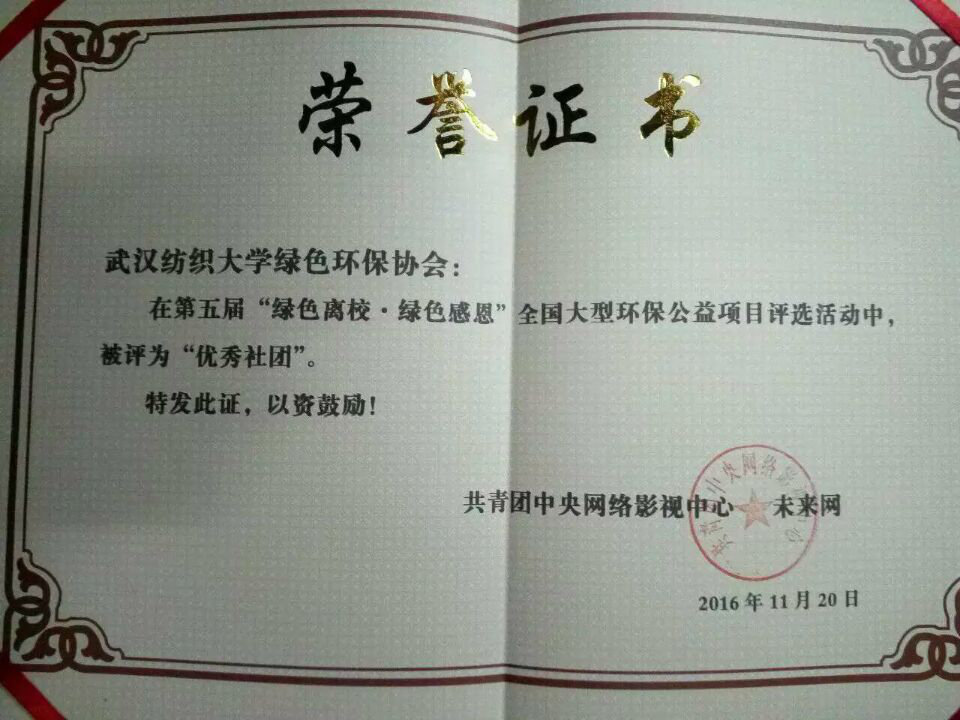 2016年,绿协开展了水质调研、绿色漂流、中小学环境教育、毕业生离校旧物循环、YOUNG桶回收、环保快闪等活动,先后获得香港环境保护协会管理成就奖、必胜客绿色小超人“最佳社团”、共青团中央绿色离校优秀社团等全国优秀社团称号,成员获得中国水卫士、湖北省环境友好使者、环境教育优秀志愿者等共计35人。