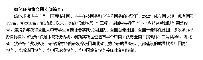 绿色环保协会水污染治理创新团队致力于水污染治理社会实践和项目研究,获评2015年度大学生小平科技创新团队,应邀到人民大会堂参加颁奖典礼,团队同时获得2016年度感动纺大年度人物特别奖。
