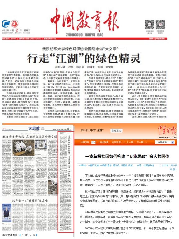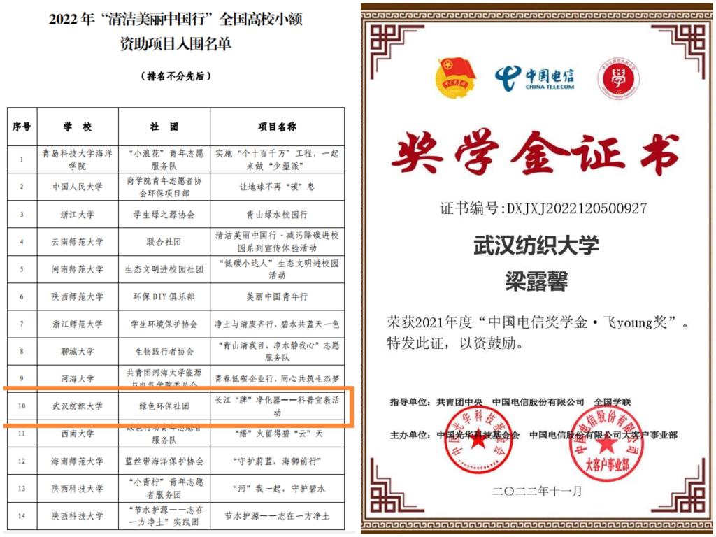 “生态启航”志愿服务队入选全国大学生生态志愿宣讲团;“绿芽”志愿服务队入选全国大学生科技志愿服务示范团队;《长江“牌”净化器科普宣教活动》入选生态环境部宣教中心 “清洁美丽中国行”全国高校小额资助项目,成为湖北省唯一;环保实践成果入选团中央“美丽中国 青春行动”社会实践成果展;环科11901班粱露馨荣获2021年度“中国电信奖学金·飞young奖”。