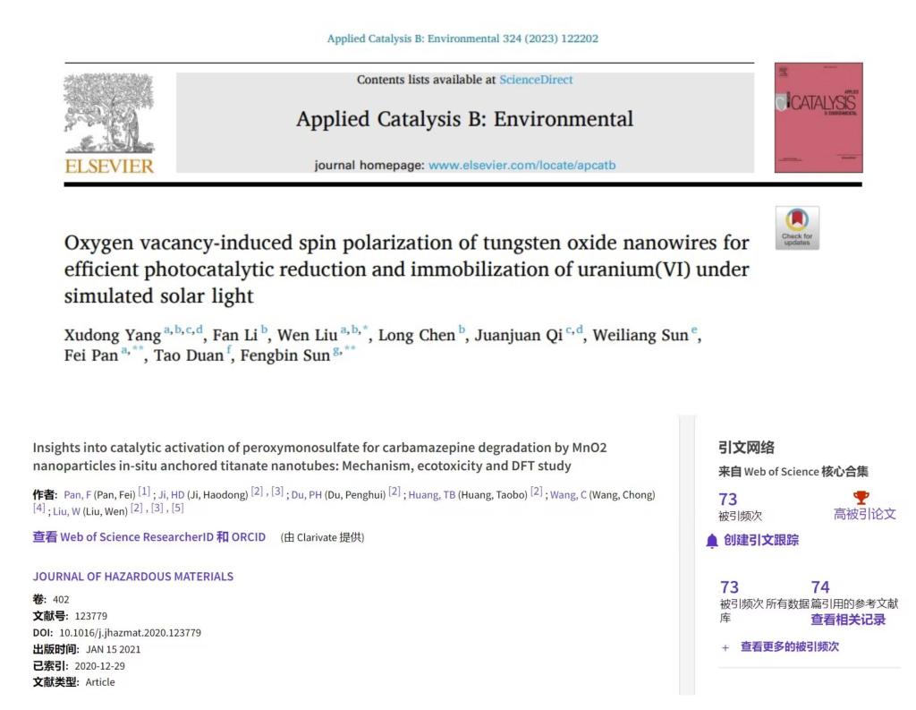 潘飞教授发表在环境科学与生态学领域TOP期刊Journal of Hazardous Materials的研究成果入选由Web of Science高被引论文,截至2023年1月3日,被引次数73次。潘飞教授和北京大学刘文研究员合作论文发表在Applied Catalysis B: Environmental (IF=24.319),影响因子突破20。全年共发表高水平论文58篇,论文被Applied Catalysis B: Environmental、Journal of Hazardous Materials、Chemical Engineering Journal等国际权威学术期刊录用,其中ESI高被引论文1篇,T2类15篇,A类21篇。
