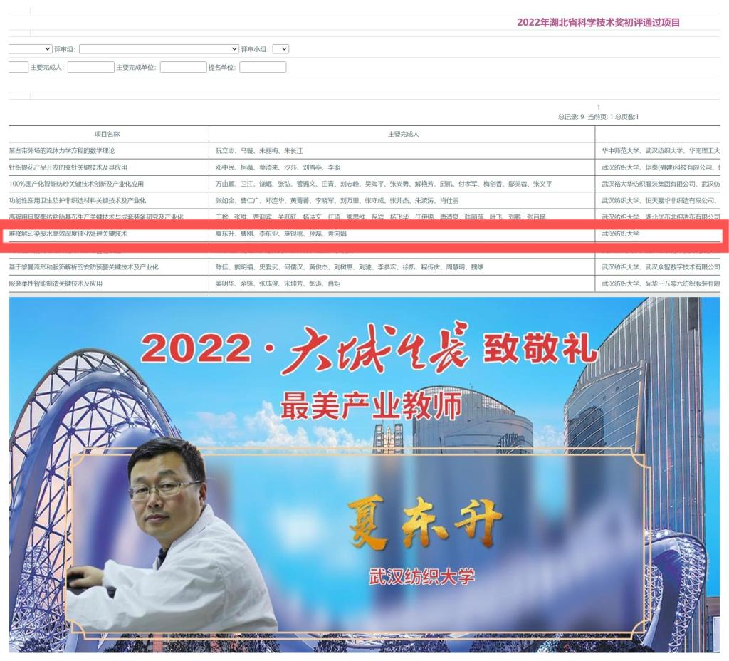 学院授权国家发明专利20项,夏东升教授成果《难降解印染废水高效深度催化处理关键技术》,申报2022年湖北省技术发明奖并通过初评;教师们深入企业、行业一线,服务地方经济科技发展,夏东升教授入选“2022·大城生长”最美产业教师推介,黄阳波博士挂职蔡甸城投环境技术有限公司副总经理。