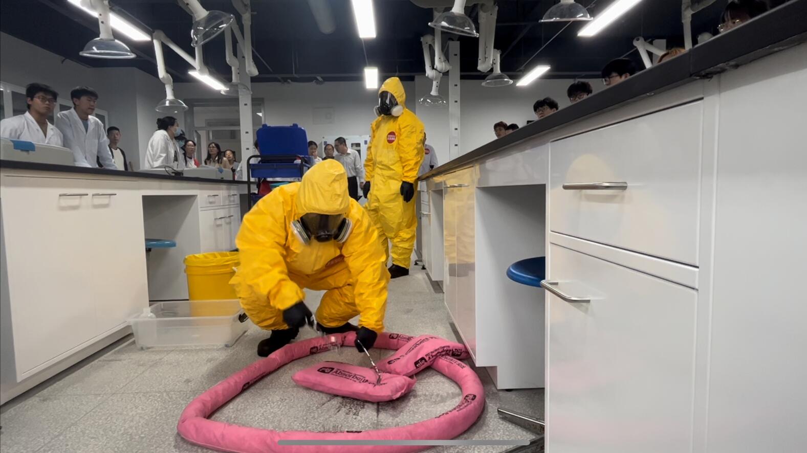 下午14点,演练正式开始。一名学生模拟在实验过程中不慎将浓硝酸洒出,伴随“浓硝酸泄漏”的警报声,指导老师迅速反应,口头通知学生立即停止实验,保持冷静,划出风险区、封闭实验室,并向上级领导汇报。参与演练的师生们沉着冷静,按照预定的疏散路线,迅速而有序地撤离实验室。