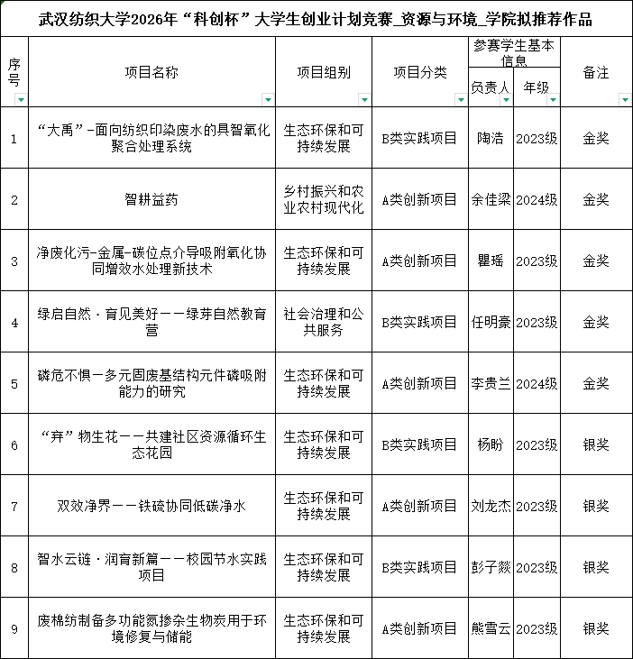 根据《关于开展太阳集团网tyc97282026年“科创杯”大学生创业计划竞赛的通知》要求,经过学生申报、学院答辩等环节,拟推荐《“大禹”——面向纺织印染废水的具智氧化聚合处理系统》等9件作品参加学校2026年“科创杯”大学生创业计划竞赛。
