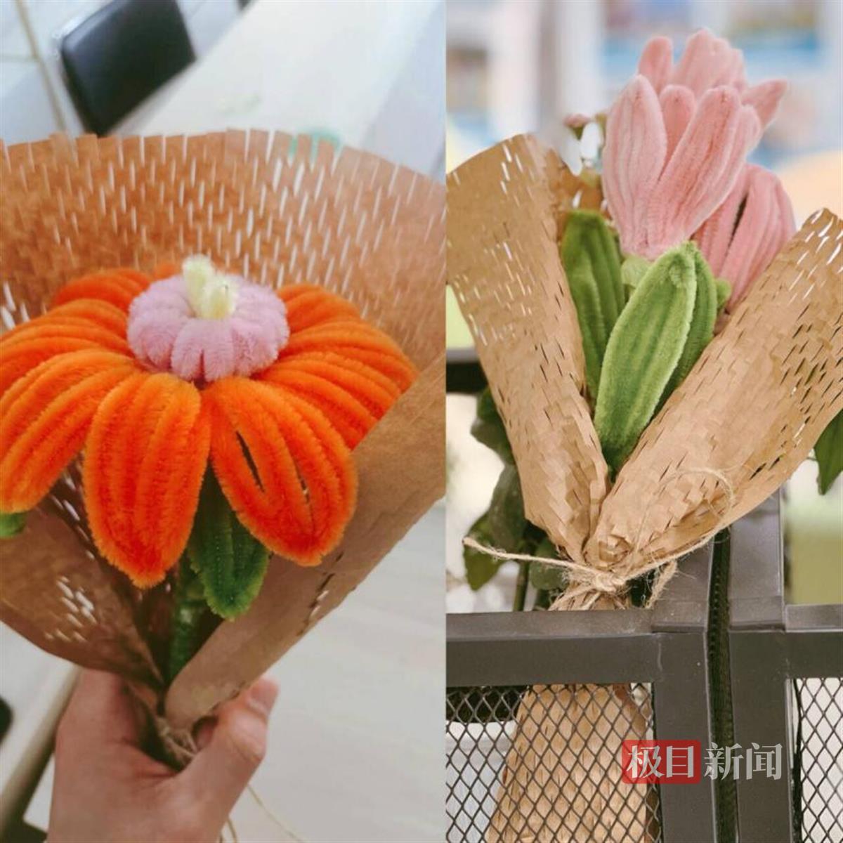 向日葵、郁金香、柿柿如意果……经过一下午的紧张制作,同学们扭出了30余种各式各样的花朵送给各岗位的女性们。“我做了一枝向日葵,我想把它送给我的学姐丁艺琛,她刻苦科研,勇于创新的精神感染着我,就像向日葵一样自信、笃定,祝愿她在新的学校继续绽放光彩。”参加活动的一名同学说。