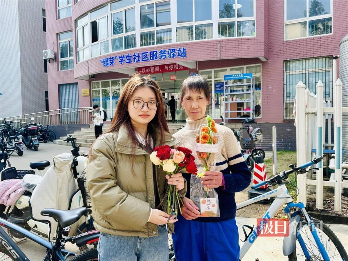 除了送给校内“偶像”,有同学将花送给自己最爱的老师。“粉色郁金香象征着永远幸福,我将这束郁金香送给我亲爱的施银桃老师,施老师温柔、耐心,对待我们就像对待自己的孩子一样,给了我很多鼓励,感谢老师对我的教导和关心,希望她永远幸福,闪闪发光。”“我准备了一支“柿柿如意果”送给10栋宿管阿姨,感谢阿姨为我们创造干净整洁的宿舍公共区卫生,祝福阿姨事事如意,天天开心。”该校同学说。