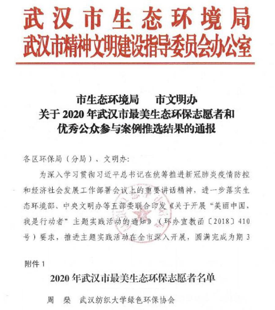 近日武汉市生态环境局及市文明办公布了2020年武汉市最美生态环保志愿者和优秀公众参与案例推选结果,我校绿色环保协会周燊顺利入选最美生态环保志愿者。