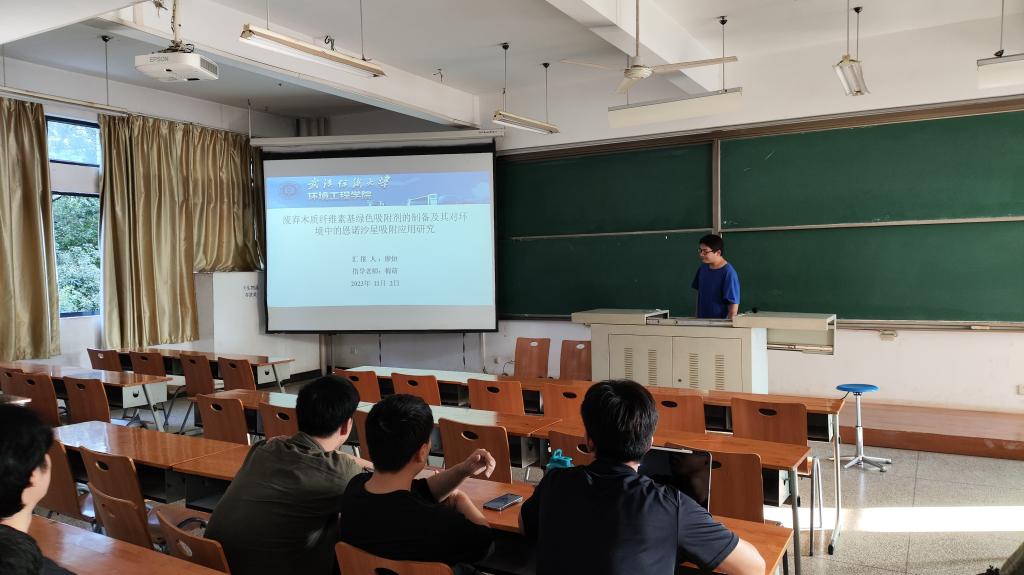 廖烜同学结合课题组前期研究,概述了共聚法改性木屑吸附剂(SS-g-SD)及其在恩诺沙星去除、富集分析中的应用研究,他阐述了探究了溶液初始pH、吸附剂投加量、吸附时间、温度等条件对吸附效果的影响;通过吸附等温线、吸附动力学和吸附热力学实验,研究了SS-g-SD对恩诺沙星的吸附特征。