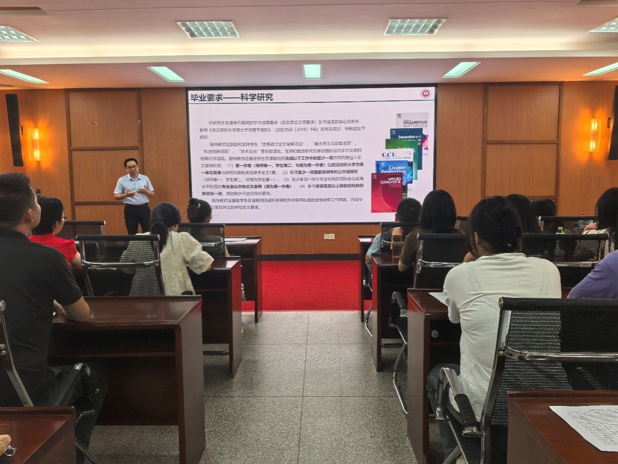 接着,院长潘飞从研究方向、学分设置、毕业要求和学位论文4个方面详细解读了2024级研究生的培养方案,提醒同学们务必认真学习培养方案,弄清楚毕业要求,主动与导师沟通,尽快适应学习环境,认真开展研究生阶段的学习。会议的第三个环节,研究生德育导师叶宇轩带领导师和研究生新生一起学习了学术道德规范,以具体的案例介绍了学术不端的行为,提示学院师生做一名合格的科技工作者,弘扬纺大精神,坚守学术诚信,做真科研,真做科研。在导师研究生双选会环节中,研究生秘书邓雨薇从个人简介、研究方向、科研成果以及招生需求四个方面系统的介绍了导师情况。双选会现场气氛热烈而有序。
