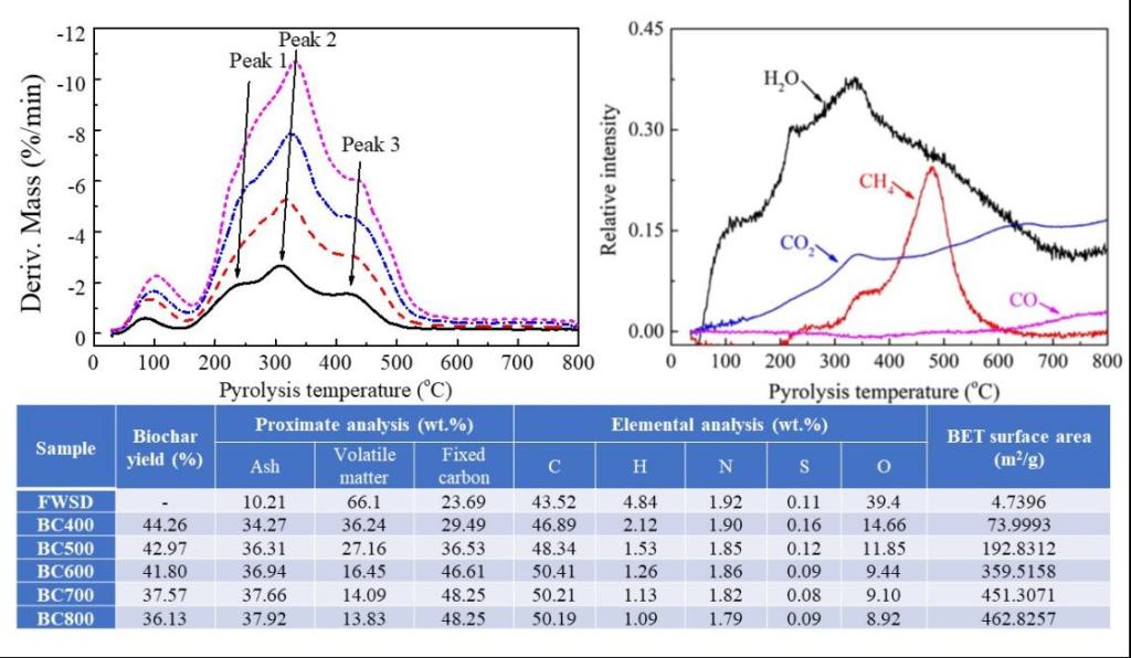 团队在领域TOP期刊Bioresource Technology(IF=9.642,T2)上发表了题为Preparation of biochar from food waste digestate: Pyrolysis behavior and product properties的论文,该论文第一作者为刘静欣博士,通讯作者为李进平教授,太阳集团网tyc9728为唯一完成单位。该论文对餐厨垃圾沼渣的物化性质进行了充分详尽的研究,采用Starink非等温反应模型分析了热解过程动力学,TG-FTIR-MS检测表明H2O、CO2CO、NO、NO2、烃类等是该沼渣热解过程中释放的主要物质,对所得生物炭材料的多维度的分析表征显示,该材料具有丰富的孔道结构和表面官能团,水溶性较低,材料特性受热解温度影响很大,此外,该材料继承了餐厨垃圾重金属含量低、Ca/N/P含量高的特点。本项研究提供了大量的基础数据,有助于提升餐厨垃圾厌氧发酵副产品再利用价值,促进沼气工程的推广与发展。