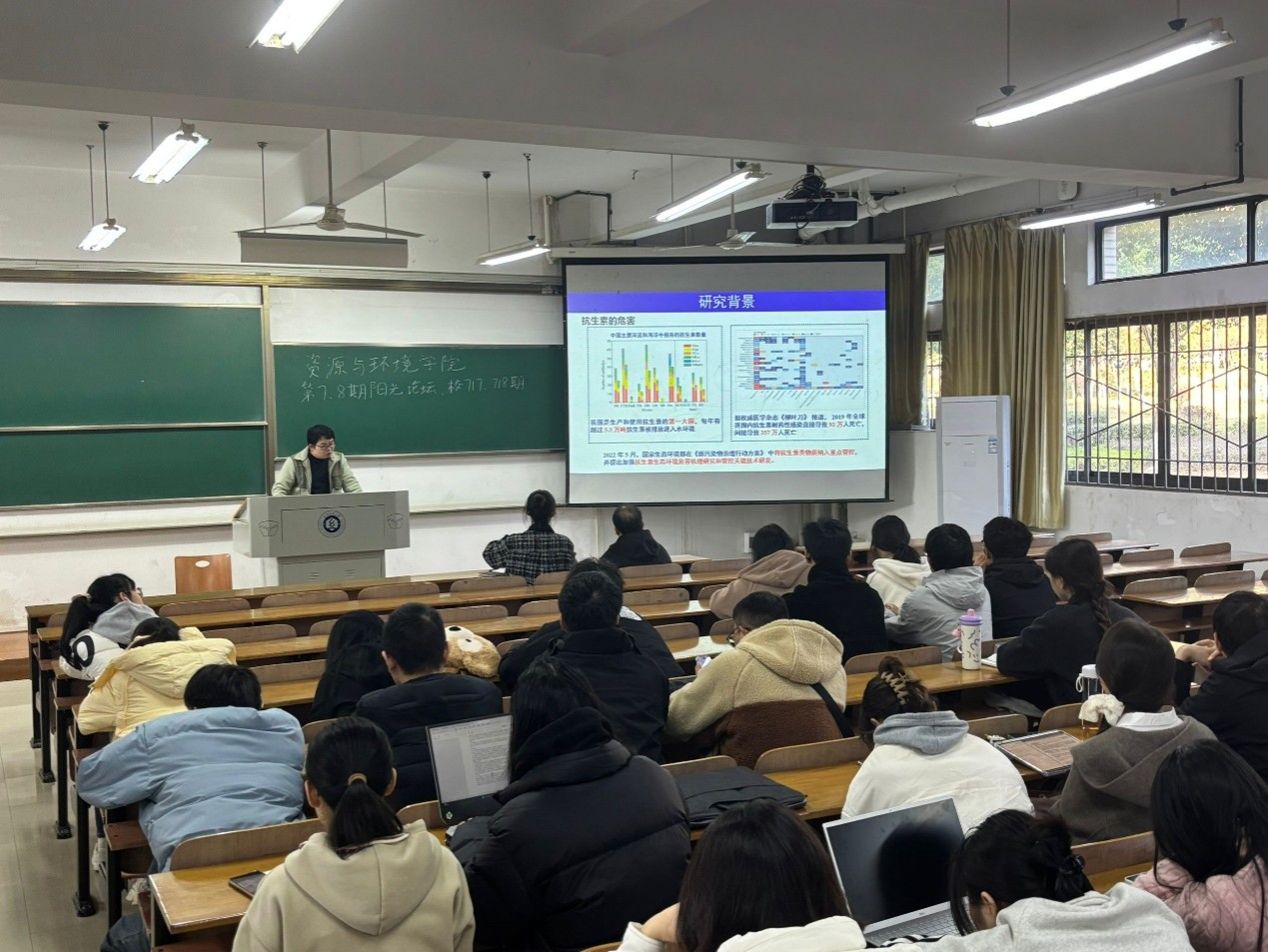 郭盛老师从近年来抗生素的使用逐渐频繁,其在水中的残留对水生生态构成的威胁出发,讲述了对比传统的芬顿技术,基于过硫酸盐的高级氧化技术能够更加有效的去除水体中的抗生素。在探索高效且环境友好的催化剂的过程中,郭老师运用3D打印技术,制备出高效稳定、容易回收的金属基催化材料,为在场的学生和教师提供了更加新颖的研究思路。现场氛围热烈,报告结束后,参会师生针对讲座内容进行踊跃提问,郭盛老师对这些问题进行了细致解答。