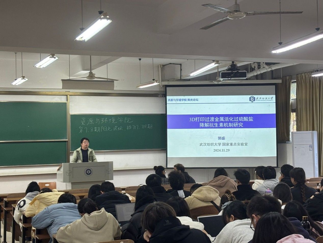 11月29日下午,学院在6号楼113教室举办校第718期阳光论坛。本次论坛由太阳集团网tyc9728郭盛副教授作题为“3D打印过渡金属降解抗生素机制研究”的报告。论坛由学院叶宇轩老师主持,学院教师及研究生参与了此次论坛。