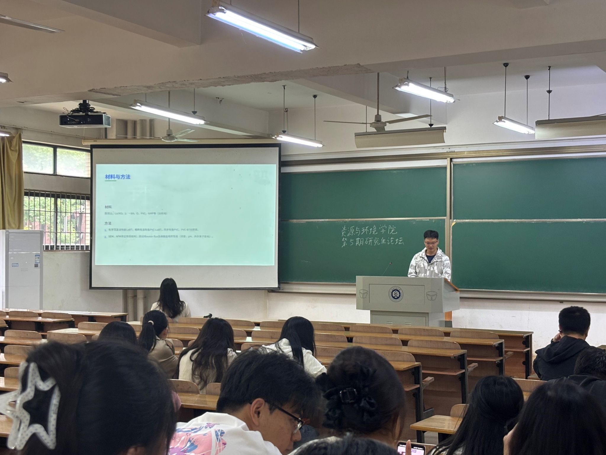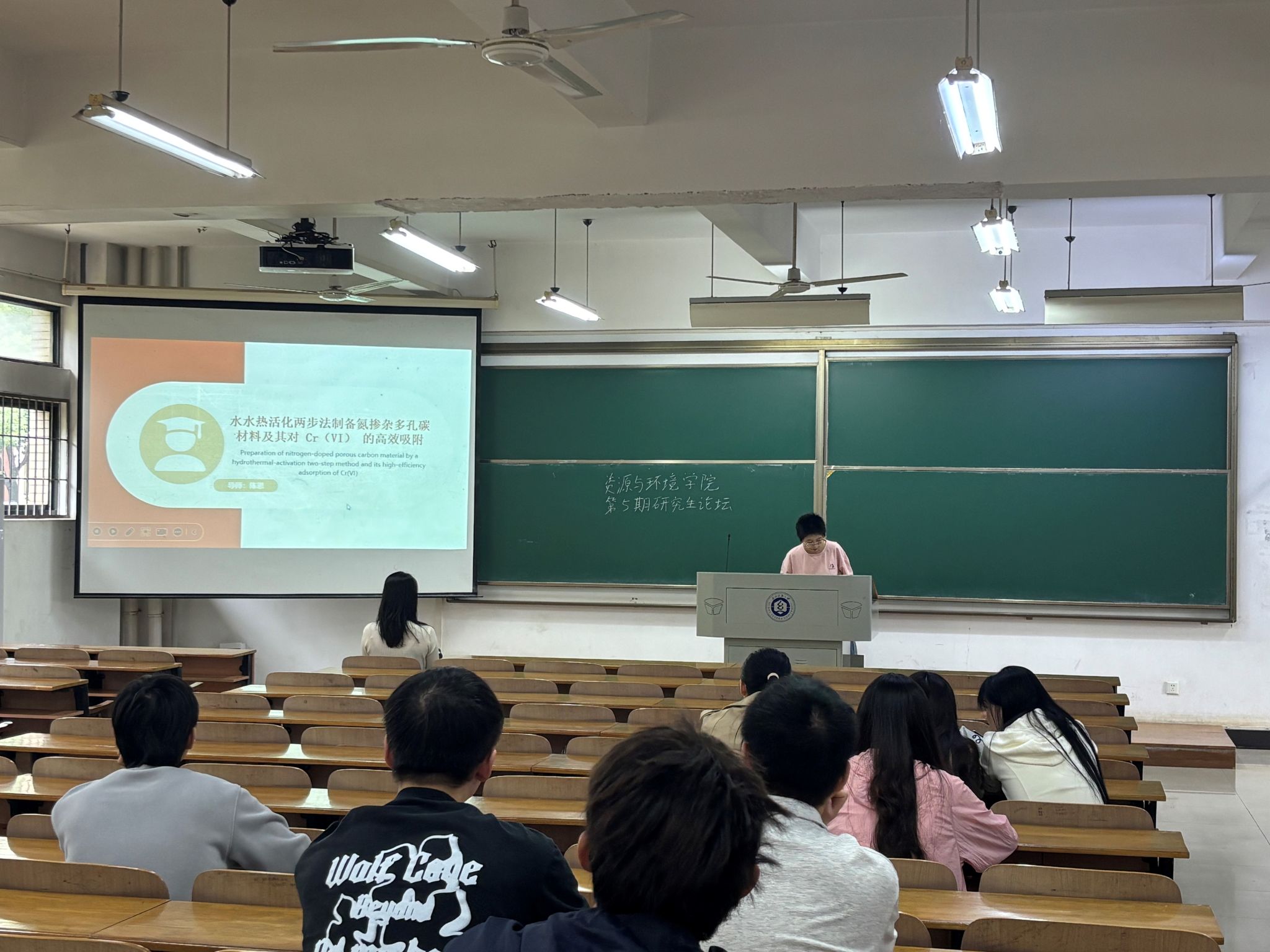 叶昕儿同学探讨了"水热-活化两步法制备氮掺杂多孔碳材料及其对Cr(VI)的高效吸附"。她讲解了以葡萄糖为碳源、尿素为氮源,通过水热合成和KOH高温活化制备高性能氮掺杂多孔碳材料。该材料拥有很高的比表面积,氮原子的掺杂优化了碳材料表面的电子结构和化学特性。这不仅增强了材料对Cr(VI)的静电吸附能力,还能提供电子将Cr(VI)还原为毒性更低的Cr(III)。