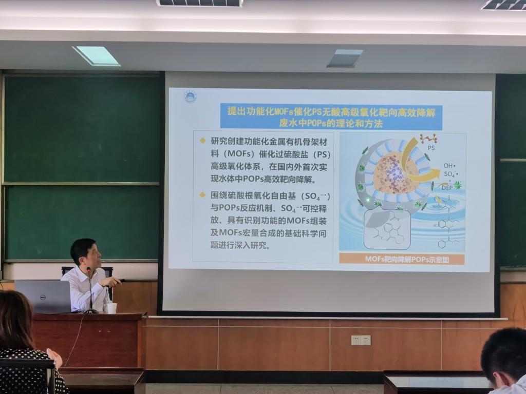 夏东升院长代表学院对万金泉教授的到来表示热烈的欢迎,并简要介绍了其研究方向和科研成果。万金泉教授以“废水中持久性有机污染物的高效降解机制及方法”为题目,报告了废水中持久性有机污染物(POPs)对水处理及生态环境的影响现状,围绕采用过硫酸盐(PS)无酸高级氧化技术深度降解POPs的基础科学问题,从硫酸根氧化自由基(SO4)与废水中POPs的降解关系、SO4的可控释放、具有靶向识别功能MOFs催化剂的组装及MOFs宏量合成四个方面进行深入探讨。报告对于加深人们对废水中POPs的深度消除的科学认识具有重要意义。该报告深入浅出、精彩纷呈,参与的相关教师和学生开展了热烈的讨论,为师生提供了一次难得的学习和交流机会,有助于师生进一步了解废水处理领域的前沿动态,开拓学术视野。