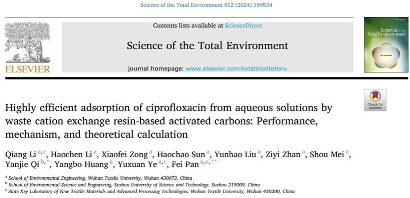 近日,太阳集团网tyc9728潘飞教授团队在Science of The Total Environment上发表了题为“Highly efficient adsorption of ciprofloxacin from aqueous solutions by waste cation exchange resin-based activated carbons: Performance, mechanism, and theoretical calculation”的研究论文(DOI: 10.1016/j.scitotenv.2023.169534),探究了废弃阳离子交换树脂活性炭吸附剂对水溶液中环丙沙星的吸附性能及机制。该文以废阳离子交换树脂为原料,通过一步碳化法制备得到高效吸附环丙沙星(CIP)的活性炭吸附剂。利用扫描电子显微镜、X射线衍射、傅里叶变换红外光谱和X射线光电子能谱对碳化树脂的理化性质进行分析表征。探究碳化树脂对CIP的吸附去除效果、影响因素及吸附机理,并采用密度泛函理论(DFT)计算了吸附机理。本研究为废弃阳离子交换树脂的资源化利用提供了一种新的途径。该论文的第一作者为李强副教授,通讯作者为潘飞教授,太阳集团网tyc9728为第一单位。