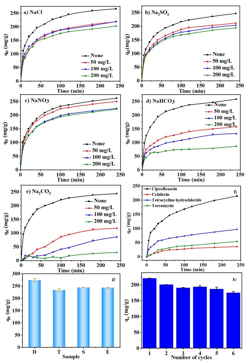 Fig. 2 (a-e) Competitive adsorption of CIP with various anion; (f) adsorption of other pollutants by the waste resin-based activated carbons; (g) adsorption under different water body; (h) adsorption-desorption of CIP onto the waste resin-based activated carbons over six cycles.