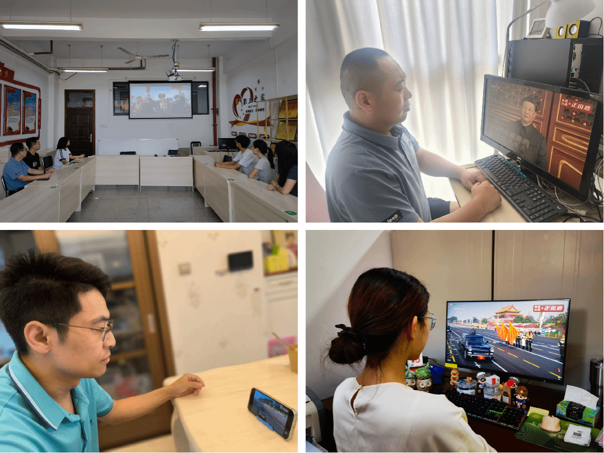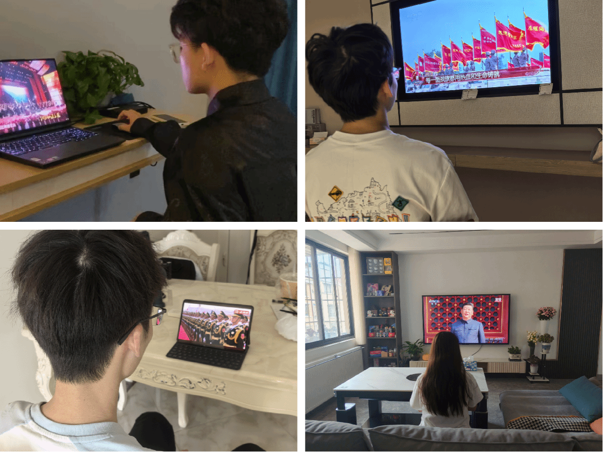 当天上午,同学们早早地来到学院会议室或在家中,怀着激动的心情等待阅兵式的开始。9时许,纪念大会正式开始,师生们全体起立,奏唱国歌认真观看了各个方阵的精彩表现,当看到整齐划一的徒步方队、威武雄壮的装备方队和英姿飒爽的空中梯队依次通过天安门广场时,大家的心情无比激动。