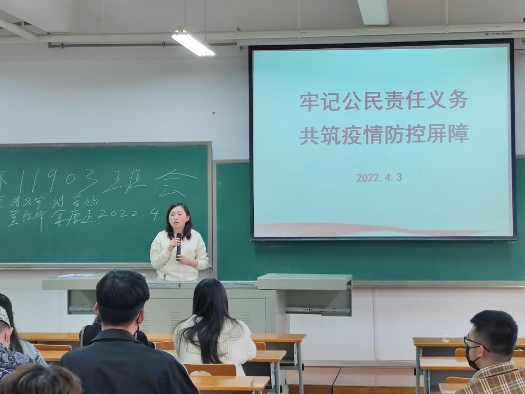 在《牢记公民责任义务 共筑疫情防控屏障》主题教育中,通过典型案例分析的形式,让同学们懂得树立责任感和公民意识,了解《中华人民共和国传染病防治法》《突发事件应对法》等有关传染病的相关法律知识,要坚持自觉防疫,主动配合好学校、学院的防疫要求,做到“非必要不出校”,按要求参加核酸检测,人人当好防疫“第一责任人”。