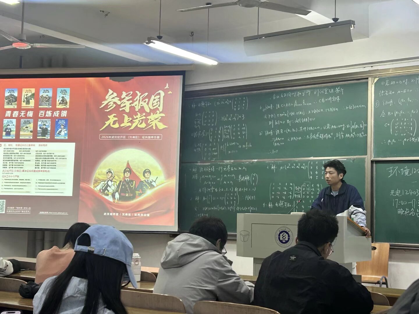 为进一步推动2026年春季征兵工作开展,增进同学们对国家征兵入伍政策的了解,引导青年学子树立“携笔从戎砺青春 热血报国正当时”的远大目标,提升征兵宣传的针对性和有效性;11月21日-11月24日,学院开展主题教育班会、入伍政策宣讲课、退役学生士兵朋辈交流系列活动,扎实推进开展征兵“三个一”宣传工作。