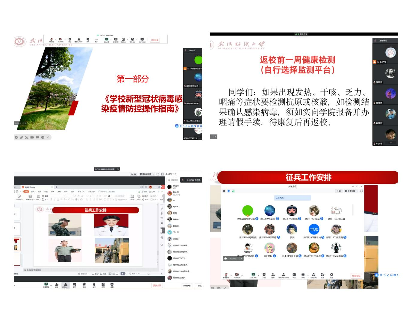 班会上,各年级辅导员带领同学们深入学习了《学校新型冠状病毒感染疫情防控操作指南》(第十版解读了开学前后一周开展健康检测的重要意义健康监测形式,提醒同学们每个人都是自己健康第一责任人,饮食有节、起居有常、动静结合、心态平和四个方面,做好自身健康防护。