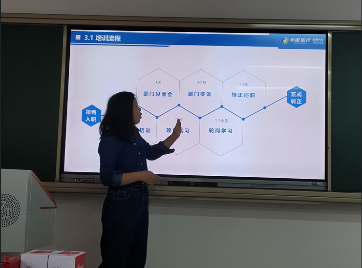 宣讲会现场,企业人事部经理余娜通过视频、PPT的方式对公司概况、岗位分工、入职流程、晋升渠道、员工福利等方面进行了详细介绍,武汉华康世纪医疗股份有限公司(公司简称:华康医疗),成立于2008年,是一家深交所创业板上市公司。公司以空气洁净技术为核心,为客户提供全过程专业技术服务,致力于成为医疗专项与实验室集成化整体解决方案服务商,是国内知名企业。