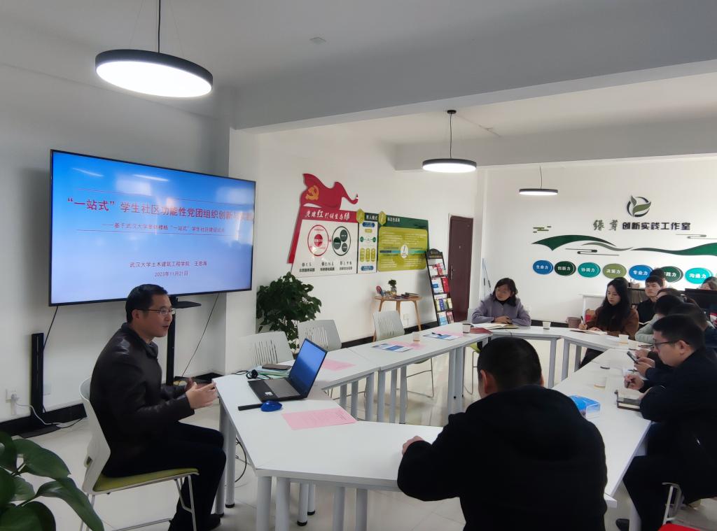 环境学院辅导员李文倩、毛成兴分别以《深入学生社区,筑牢基层战斗堡垒--探索学生社区党员先锋岗服务模式》、《学生党员在社区发挥作用的探索--以党员宿舍责任区为例》为题,以十栋“‘绿芽’创新实践学生服务驿站”工作开展为基础,对十栋“一站式”社区党员下沉、党员服务等社区党团建设工作进行了分享。