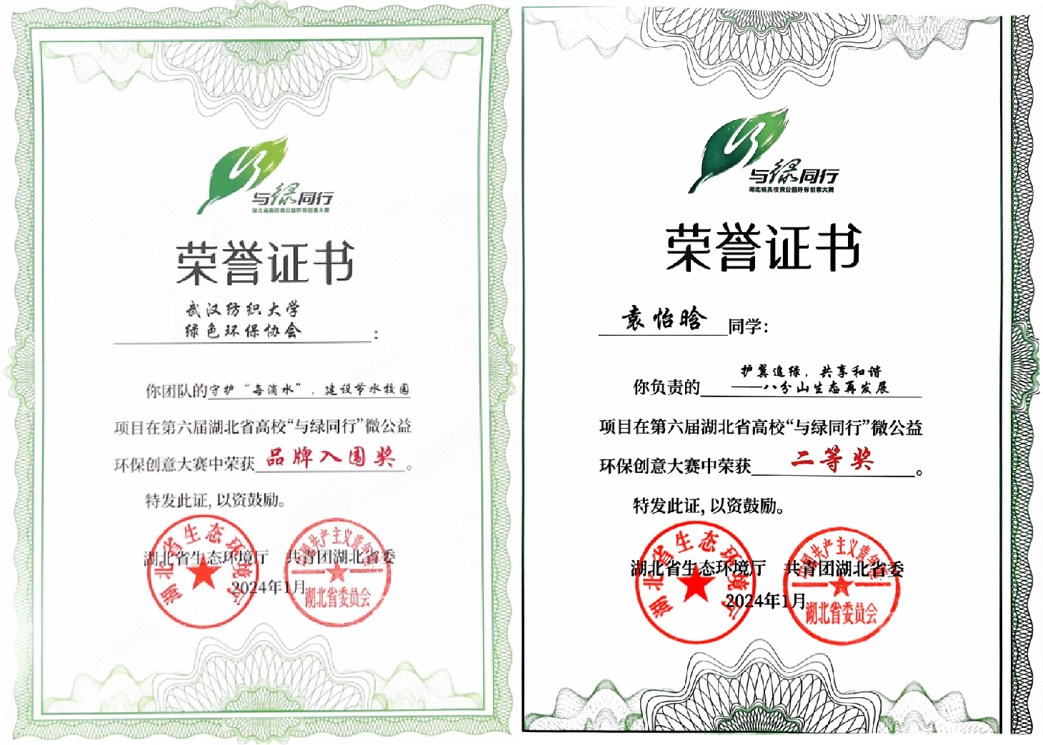 近日,第六届湖北省高校"与绿同行"微公益环保创意大赛获奖名单公布,本届共收到全省79所高校提交的403个项目方案,经过现场答辩和专家评审,学校共有3个项目获奖,分别是绿色环保协会《守护“每滴水”,建设节水校园》获品牌入围奖,环境学院志愿者协会《护翼追绿,共享生态和谐》项目荣获二等奖,绿色环保协会《筑梦绿城,“纺”寻仙踪》项目获得入围奖,学校获评优秀组织单位。