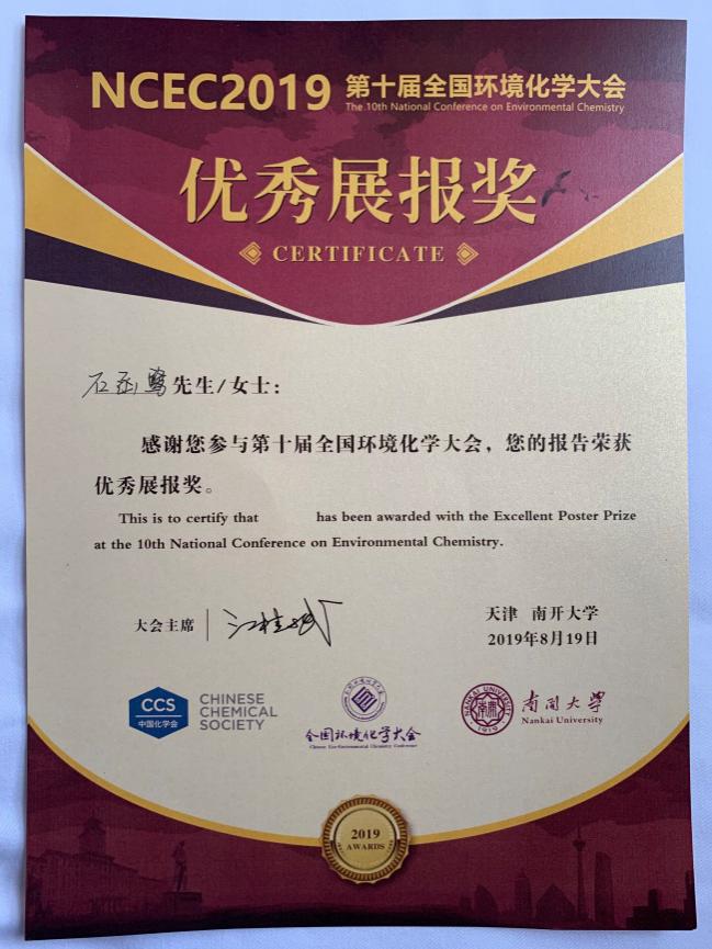 【为你点赞】研究生石函鹭获第十届全国环境化学大会“优秀展报奖”