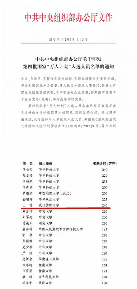 近日,中共中央组织部办公厅印发了《关于印发第四批国家“_”入选人员名单的通知》,我校王栋教授入选青年拔尖人才(自然科学类),支持经费240万,为该项目最高支持,今年湖北省属高校仅1人入选。这是我校在国家级人才项目上取得的突破性进展。